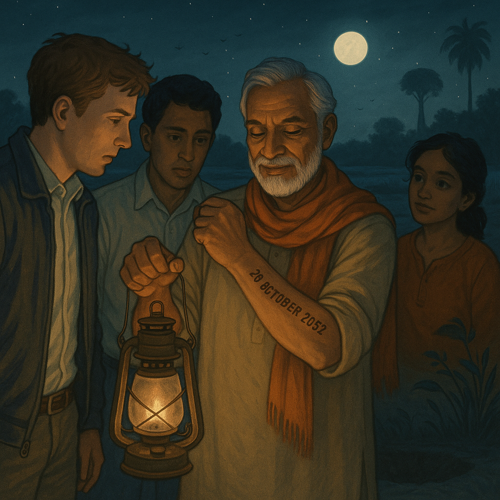 Tras ver la fecha que aparecía en el móvil, Peter y yo no supimos cómo encajarlo: podía ser un simple fallo técnico, pero al vernos agitados, se la mostramos también a Rajkumar. Él entrelazó sus manos y nos miró con esa sonrisa de quien sabe algo que el resto no conoce. «Seguidme», nos dijo. Peter y yo nos miramos y decidimos continuar, mientras Akshi parecía totalmente familiarizado con la situación y brincaba tras los pasos del sacerdote. Rajkumar encendió una especie de candil y cruzamos por el bananero hasta advertir a lo lejos una extraña estructura en forma de plumero. Al encender la linterna, comenzamos a sentir el sonido de las aves nocturnas en las marismas, la luna parecía más cercana y, de repente, Rajkumar se giró hacia nosotros de forma violenta mostrando en su muñeca el tatuaje de una fecha: 20 de octubre de 2052. «Ese día fue cuando todo acabo y tuvimos que preservar lo real para no morir del todo». Al echar la vista hacia los pies, comprobamos un enorme socavón en la tierra. Era el impacto de algo que había sucedido en algún momento del pasado. O del futuro.