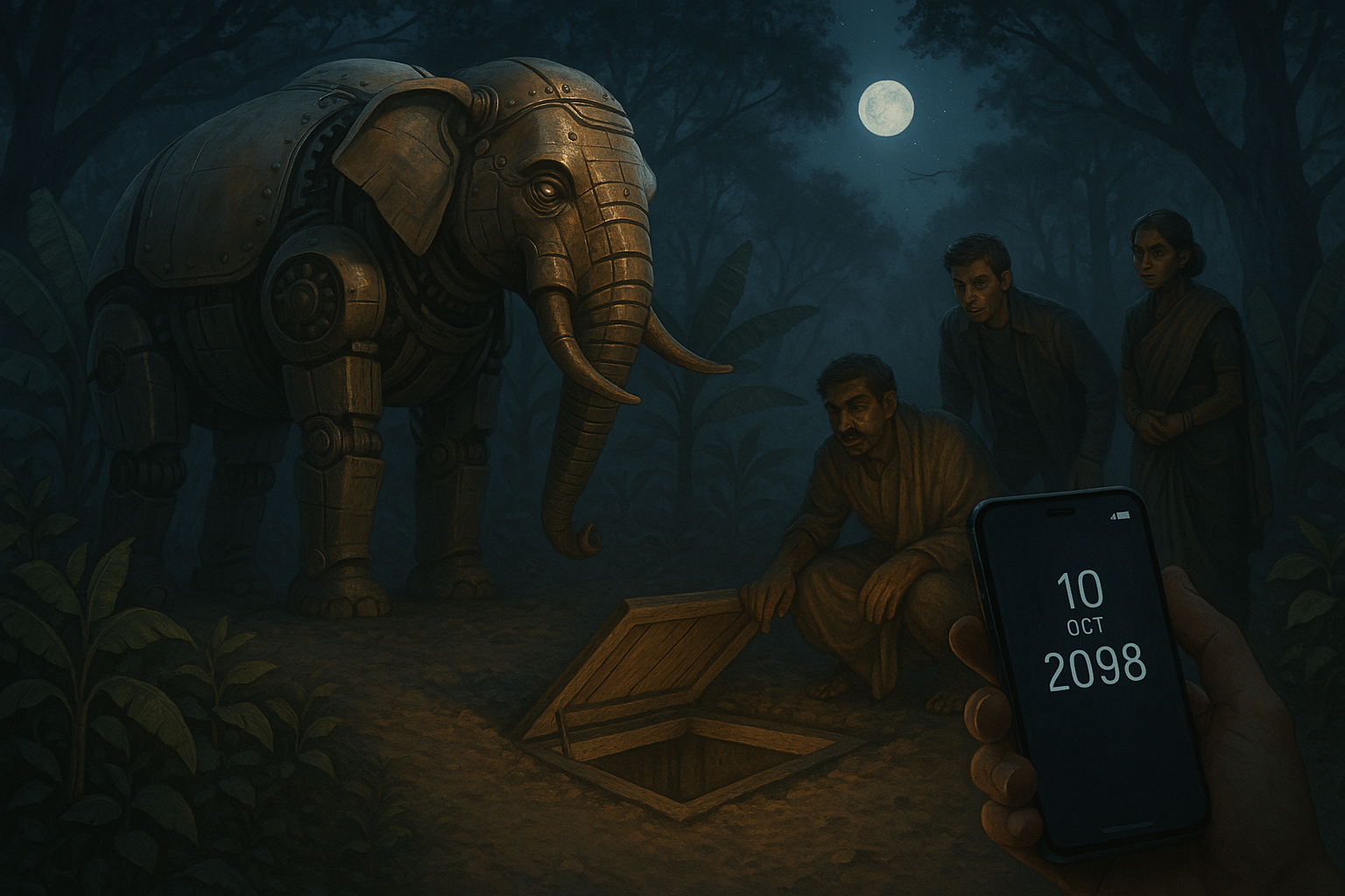Irinjadapilli Raman era un elefante mecánico que, según Rajkumar, había sido donado por una entiedad medioambientalista a fin de sustituir a los elefantes reales utilizados durante el ritual conocido como Nadayiruthal. Durante esta ceremonia, muchos elefantes son maltratados por sus cuidadores y obligados a tareas forzadas para contentar a los devotos, quienes conciben al animal como una ofrenda a los dios. «Irinjadapilli llegó antes de que sucediera todo». Peter y yo no entendíamos muy bien a qué se refería Rajkumar, quien nos llevó a través de la plantación de plataneras de nuevo. Peter me confesó que no le gustaba nada todo aquello y me propuso huir en algún momento. Por su parte, Akshi no se separaba del supuesto sacerdote. Tras atravesar los árboles, entre cuyas ramas se colaba la luna y los lejanos aviones parecían ahora lejanos destellos en el firmamento, Rajkumar llegó a un punto de la plantación y se agachó. Desenterró una porción de tierra hasta encontrar una vieja tabla de madera. Era una trampilla, la entrada a un lugar que desconocíamos. En algún momento, dejamos de escuchar ruidos lejanos. «Mejor nos vamos», le dije yo. «¿Adónde?», preguntó Rajkumar. «Fuera de aquí». Pero él sonrió: «Me temo que ya no podéis volver». Cuando consulté el móvil para encender la linterna, vi un dato extraño: era el 10 de octubre de 2098.