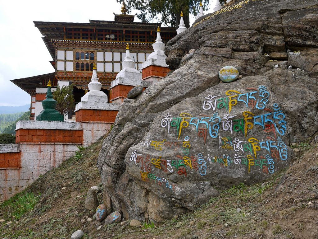 Otro de los lugares más importantes y sagrados es el templo de Kurje Lhakhang. Construido en el siglo VII, está dividido en tres edificios dedicados cada uno de ellos a un rey de Bután. El más antiguo de ellos contiene en una cueva la roca con la huella que dejó el cuerpo de Gurú Rimpoche al meditar, y el segundo también contiene su imagen gigante.